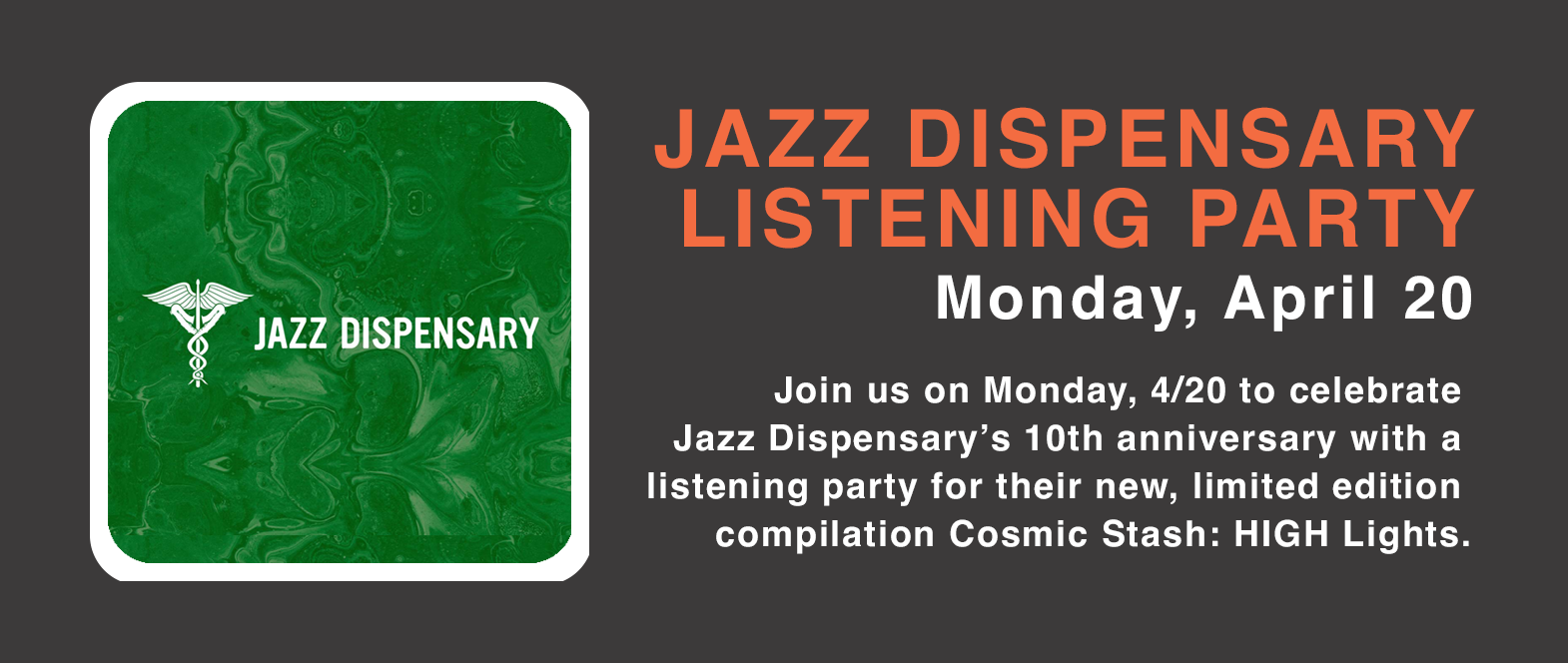 Join us on Monday, 4/20 to celebrate Jazz Dispensary’s 10th anniversary with a listening party for their new, limited edition compilation Cosmic Stash: HIGH Lights.