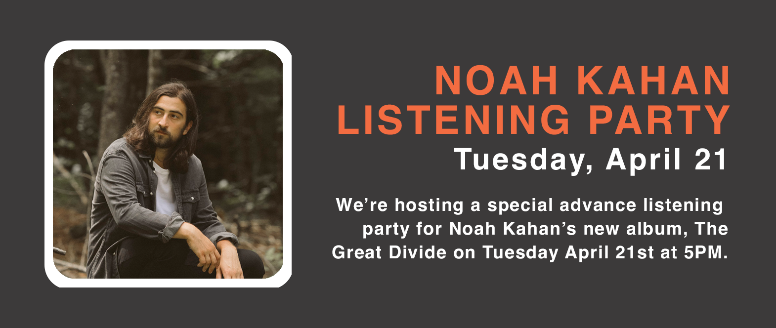 We’re hosting a special advance listening party for Noah Kahan’s new album, The Great Divide on Tuesday April 21st at 5PM. No need to RSVP, but stay tuned for giveaways!