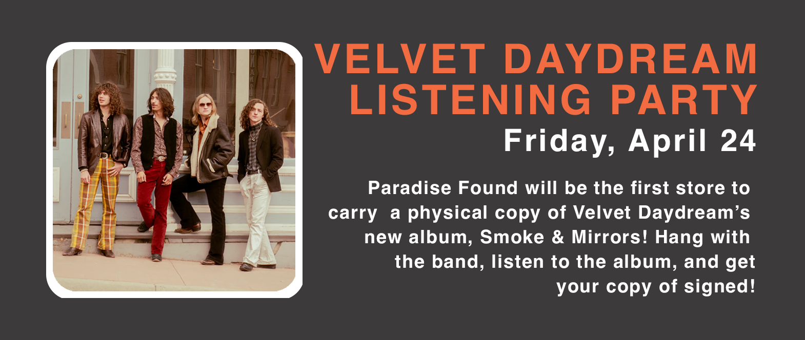 Paradise Found will be the first store to carry a physical copy of Velvet Daydream’s new album, Smoke & Mirrors! Hang with the band, listen to the album, and get your copy of signed!